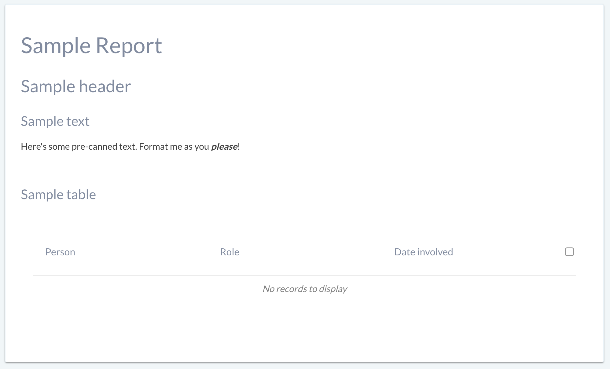 Canopy has a report template “form” builder. This allows you to build the general layouts using headers, nested headers, rich-text blocks and tables.