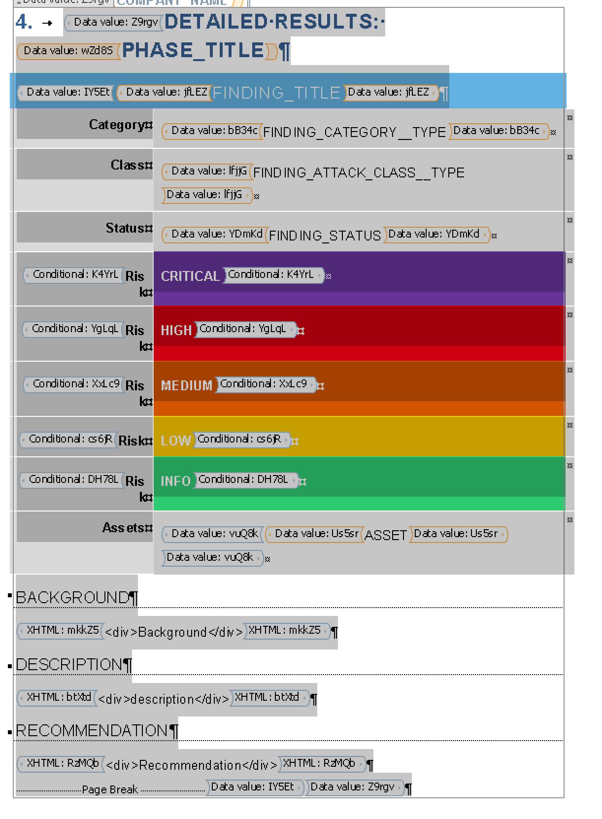 The plugin allows you to import the Canopy data fields, along with your own custom report fields, and any custom fields you might have defined via the admin interface. This “data model” (output as an XML file) allows you to insert placeholders for data that will be populated during the report generation process. Around these data placeholders you can add logic for repeating (where you expect to have 0, 1 or more entries) and conditionals (“if” logic) that you can use to dynamically include/exclude pieces of data or even entire sections of a document (e.g. if you want a web app summary section to be added when web app findings are present, you can do that using conditionals - see below).