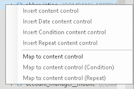 For Repeat sections - i.e. expandable nodes in the XML tree - the options for Insert Repeat content control will be available: