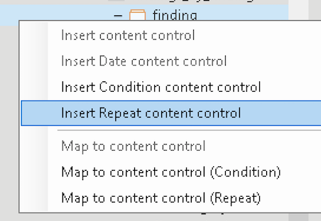 Once all of the fields and conditionals are mapped, the repeat can then be added. Using the mouse, select the finding block and then right-click and select Insert Repeat content control. This will add a repeat tag around the entire block.