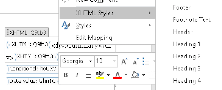 However, when considering blocks and styling, Word needs to be told what style to apply for the base styling. The block content can then influence the styling. Our block controls are the XHTML fields inserted into the Word document (i.e. wrapped with XHTML label and containing <div>Field name</div> content placeholders). These fields must be configured to use a specific base style when something other than Normal is required. This can be done by using the right-click context menu and selecting the appropriate style from the XHTML Styles option: