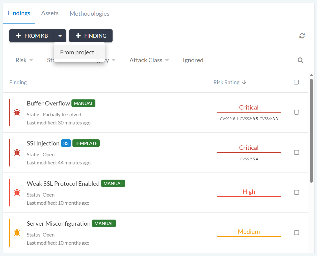 Canopy supports re-testing of previously reported findings. Findings can be selected during the re-test phase creation step. However, it’s also possible to add findings from previous phases via the From Project button, which is accessed by clicking on the + FROM KB button on the Phase view.