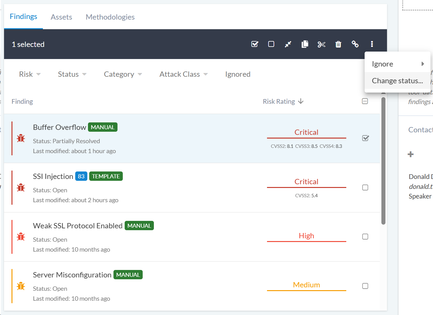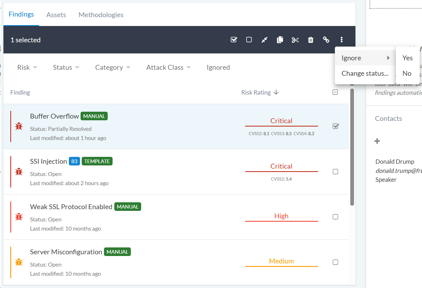 Ignoring findings allows you to temporarily hide findings that you don’t want to include in your current workflow or reports: