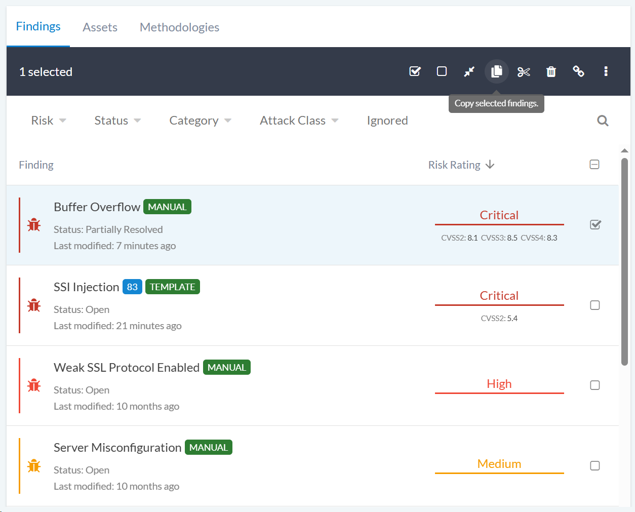 Select the finding(s) you want to copy by checking the box next to them.
