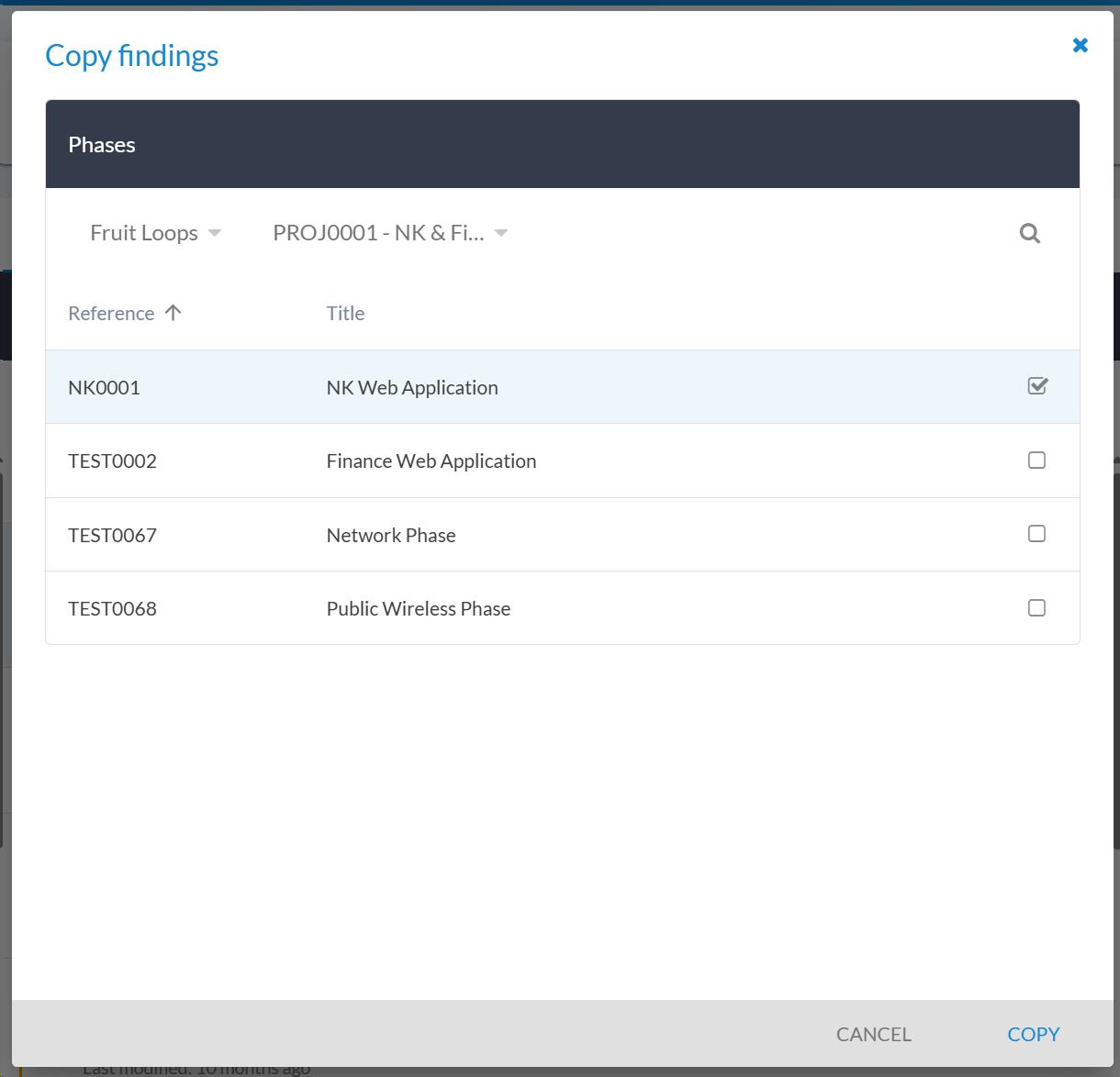 The copy feature allows you to duplicate a finding within the same phase or to another phase: