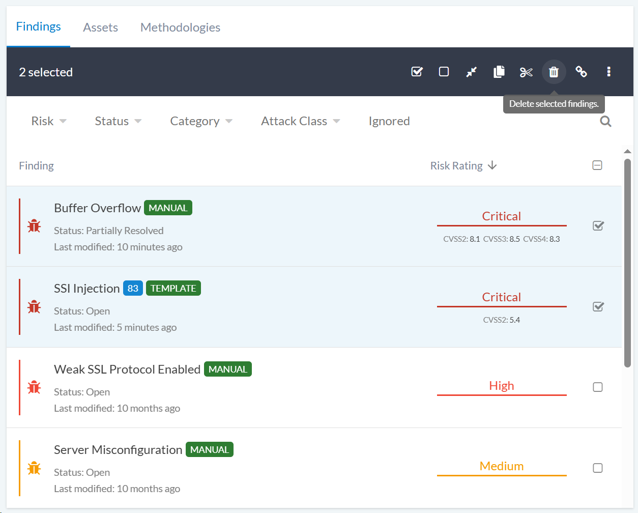 Select the finding(s) you want to delete by checking the box next to them.