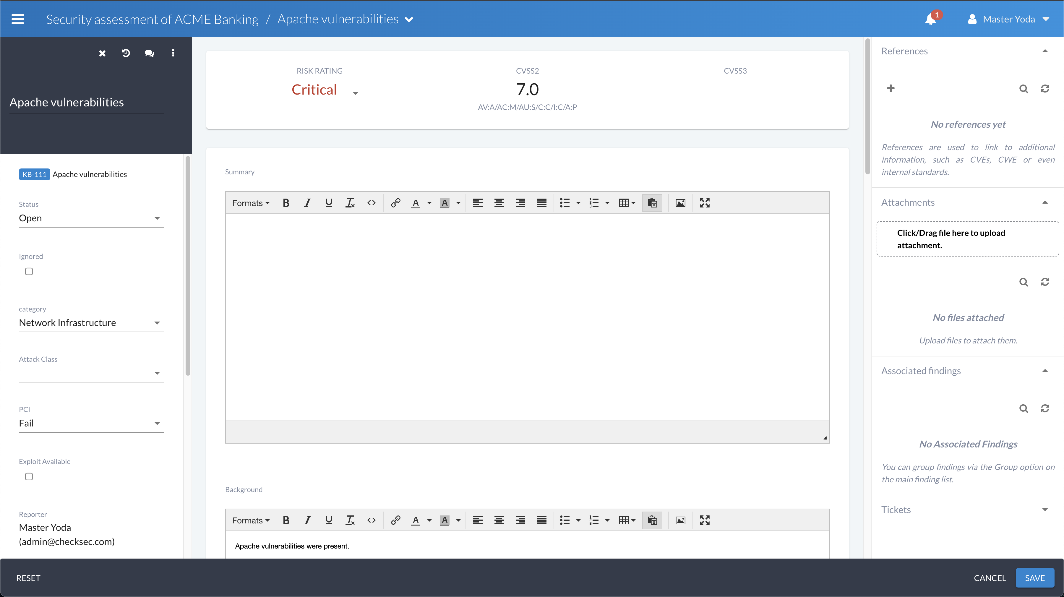Finding rating systems are used to tailor Canopy to the risk rating needs of each company and their clients. By default, Canopy uses a Critical-to-Info rating system alongside CVSSv2, CVSSv3 and CVSSv4.However, when users need their own rating system this can be added through the use of custom fields (i.e. to storing rating values) and a custom rating calculator plugin. This gives Canopy significant flexibility in adapting to the specific needs of each company that uses it.