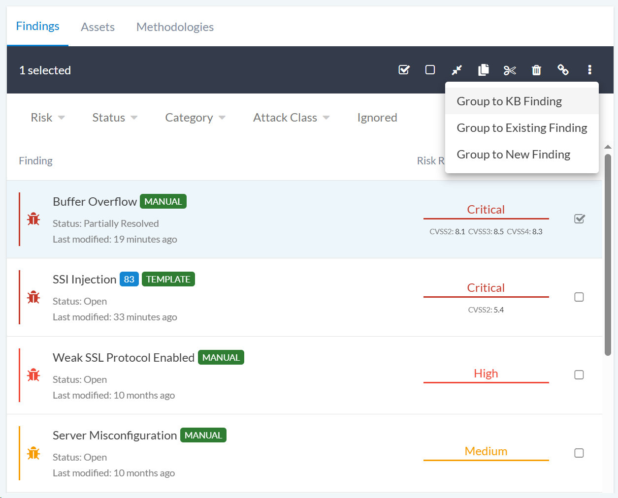 Grouping allows you to combine multiple findings into a single entity. This is useful when similar issues are found across multiple assets or when different instances of the same vulnerability type need to be consolidated. Findings can be grouped in three ways: