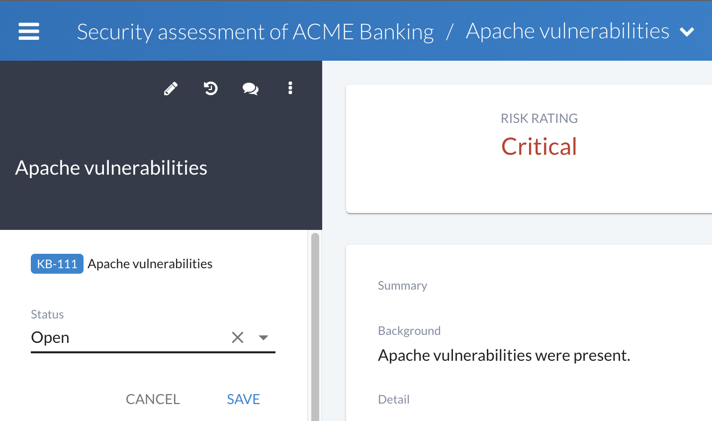 To edit a finding using inline editing, simply open the finding you want to work on, and click the specific field. Depending on the type of field, you may see a save button or not. If you do not see a save button, this means that once a change has been made (e.g. selection from a drop-down, change of a date), the change is saved automatically.