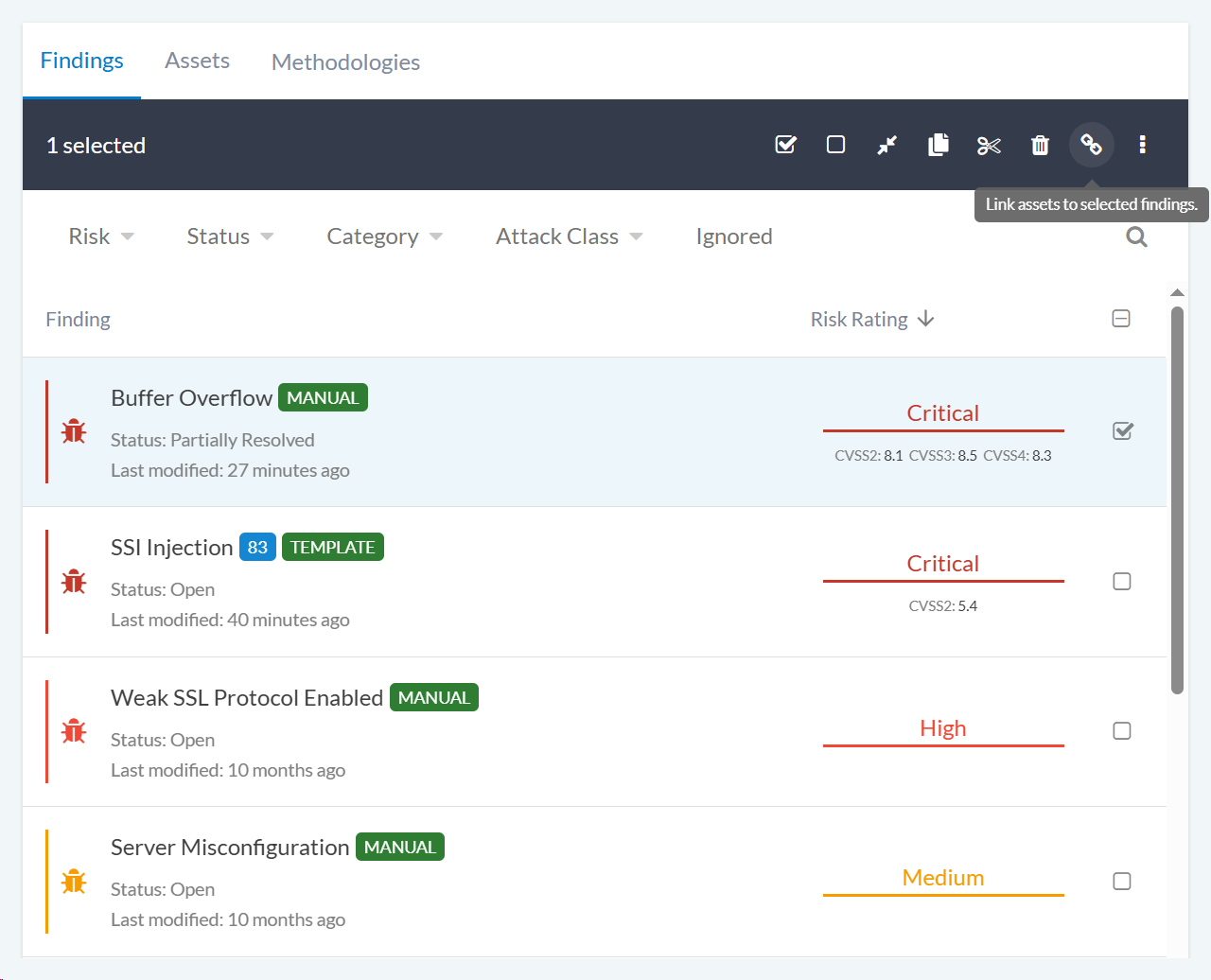 The link assets feature allows you to associate assets with findings, making it easier to track which systems or components are affected by each finding: