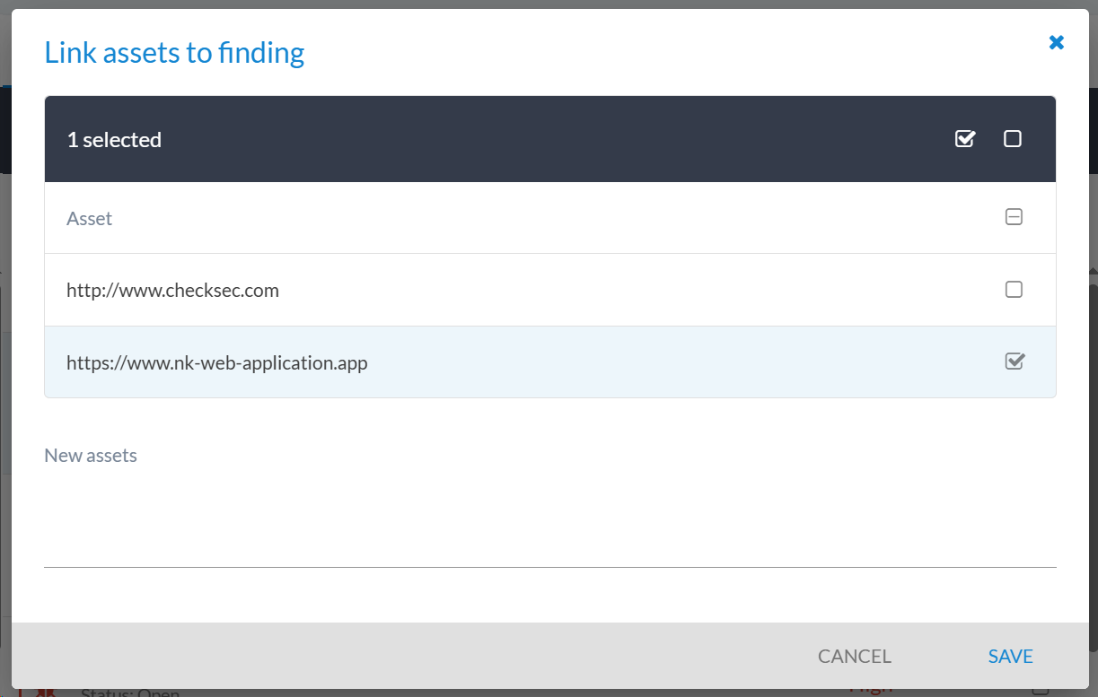 After clicking the “Link assets to selected findings” button, a modal dialog will appear allowing you to select existing assets or create new ones: