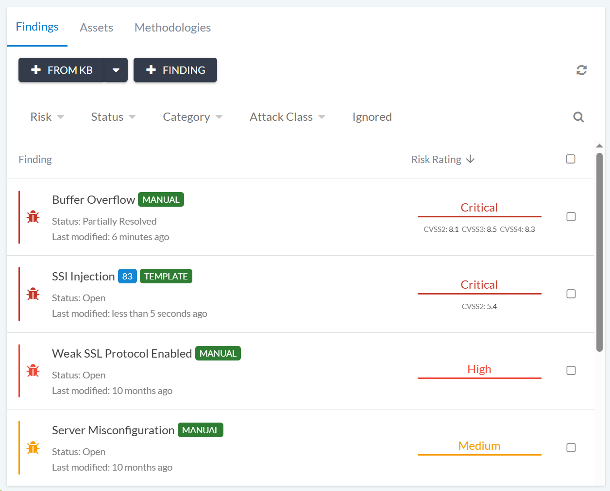 A Finding can be added to a Phase in different ways. The most common approaches are to re-use a Finding from the Findings KB, or to import from support tools. In this section, we expand on all options supported via Canopy’s web UI.