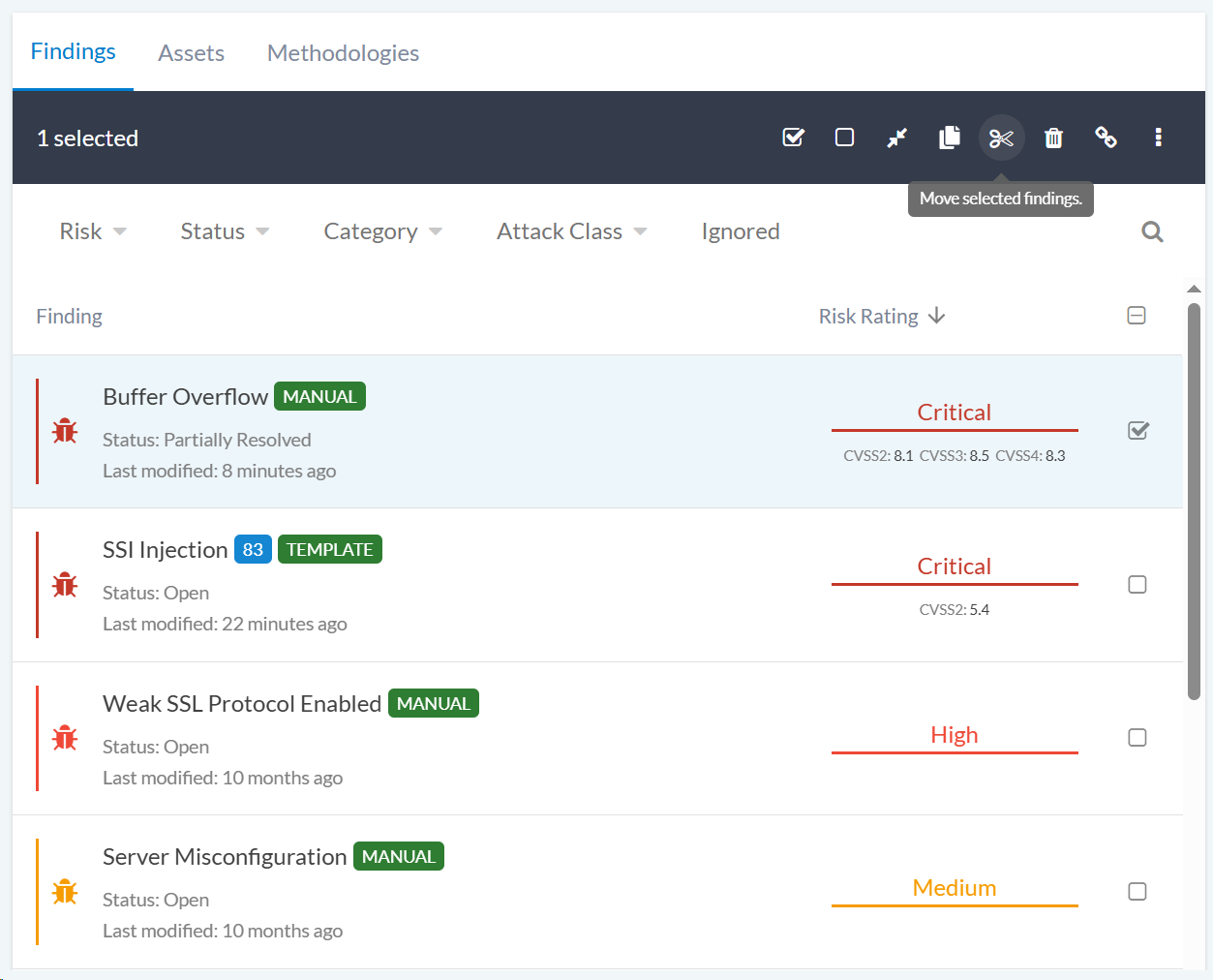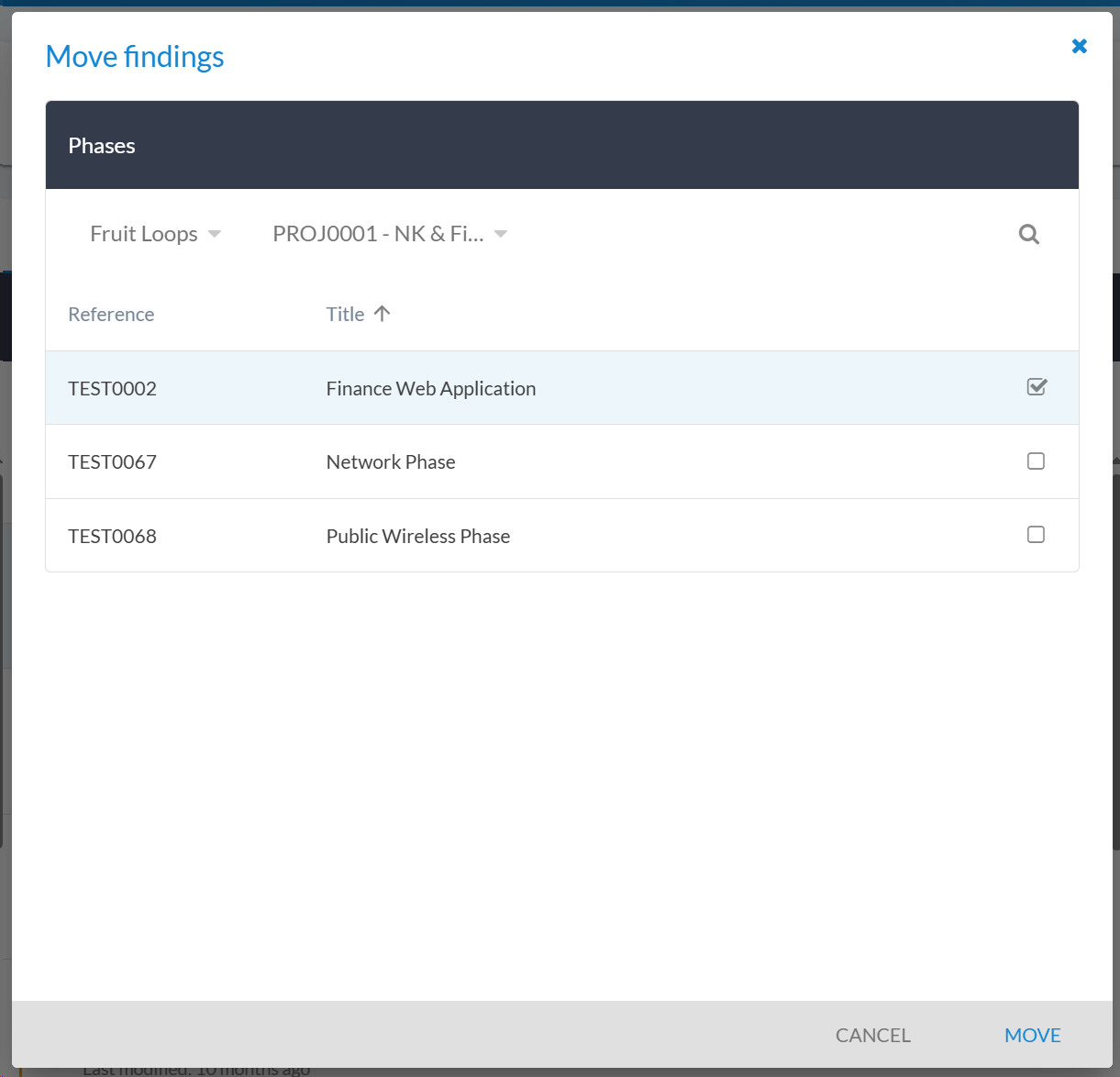 The move feature allows you to relocate a finding from one phase to another: