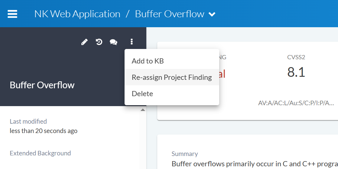 Findings are tracked across phases by having the same Project finding ID. The reassign feature allows you to change a finding’s history by modifying its Project finding assignment: