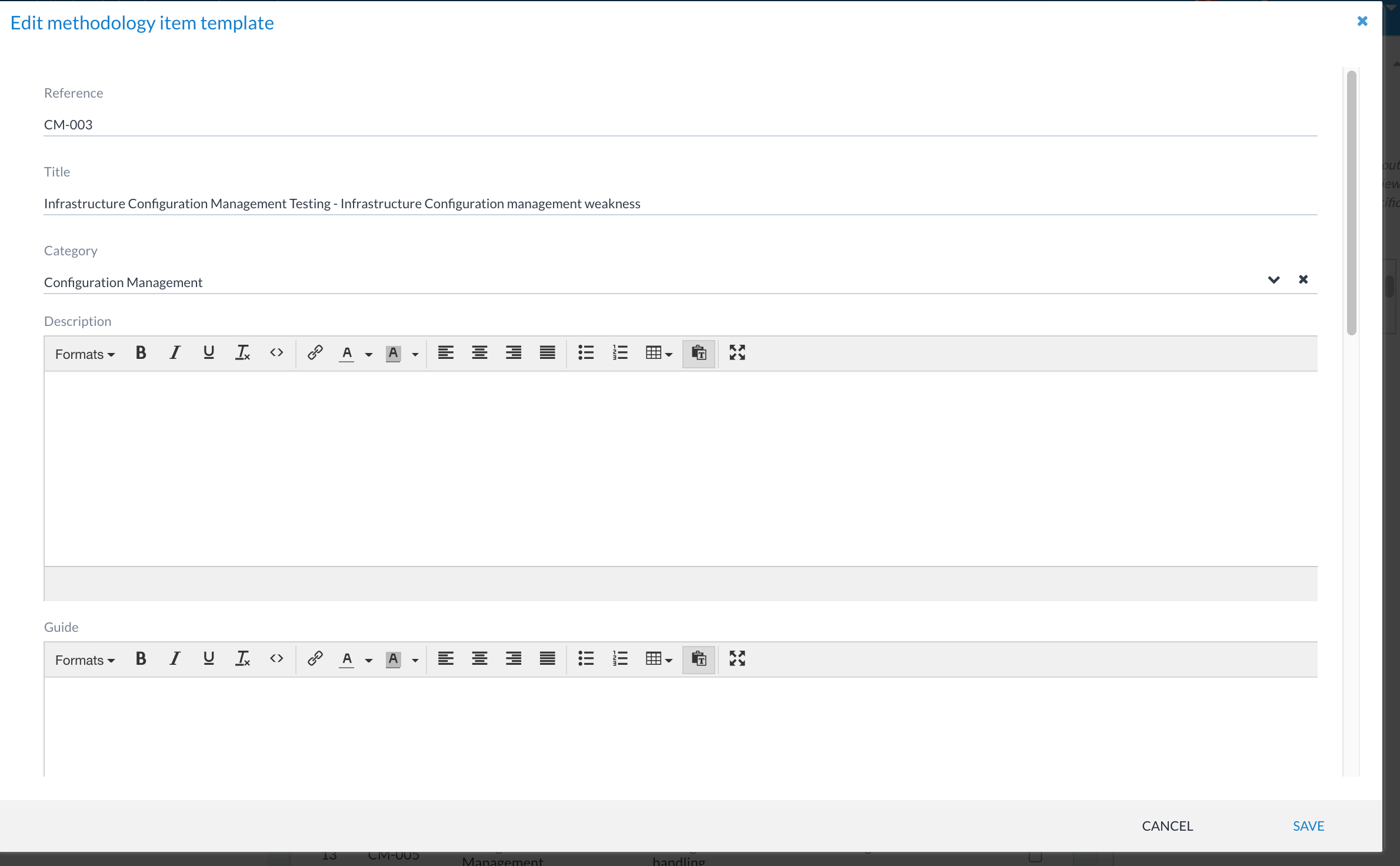 Once the methodology template has been created, it’s easy to start adding items. Click on the +METHODOLOGY ITEM button. This presents you with an edit window where you can add information such as the reference, title, descriptions, test guides, set ratings and so on.
