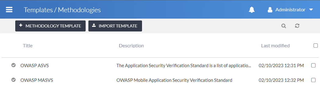 List of methodology templates available in the system