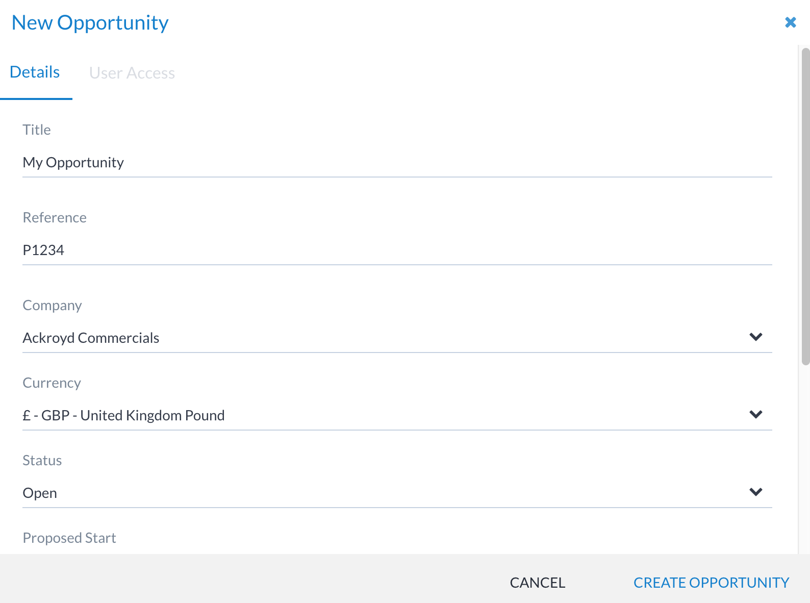 Adding an opportunity is achieved through the + OPPORTUNITY button available on opportunities list view and on the client view. This presents a New Opportunity window, as below: