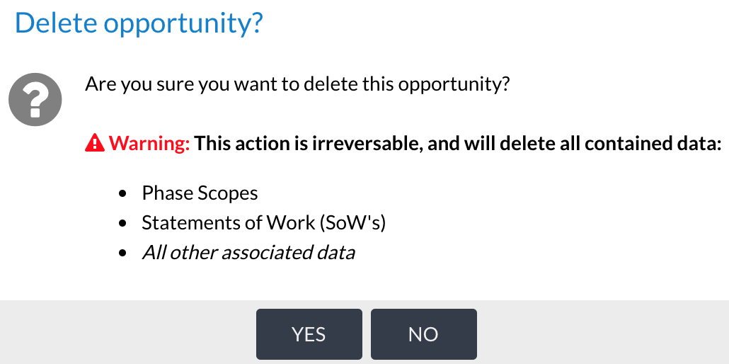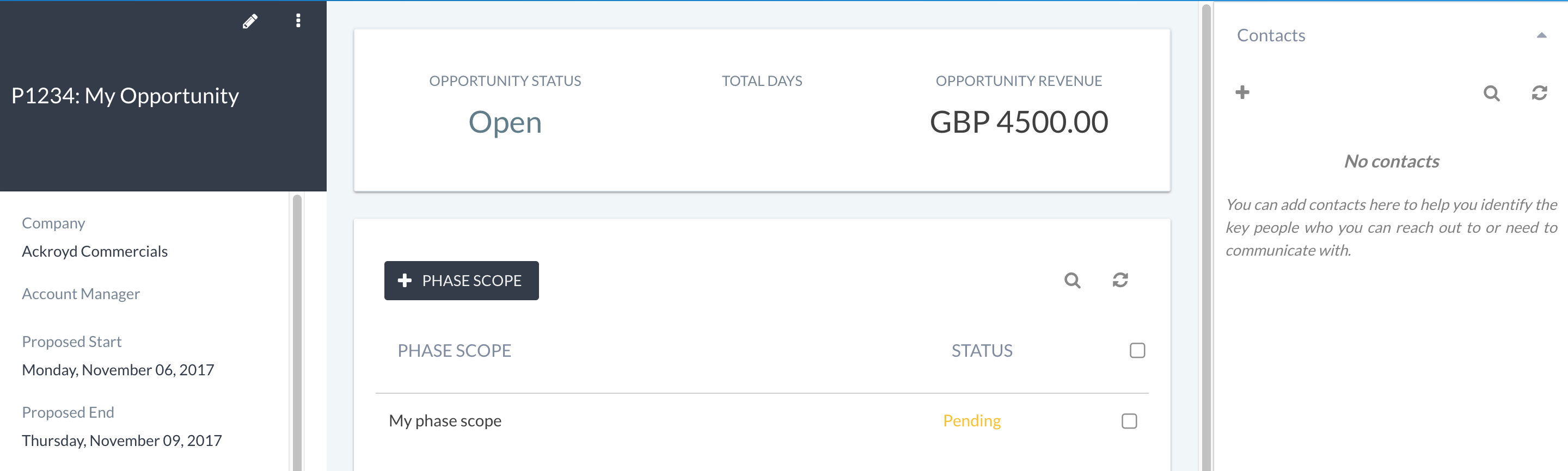 The opportunity view shows an overview of the entire opportunity, including proposed dates and the status, along with financial information (if required). From this view it’s also possible to add phase scopes and statements of work (SoW).