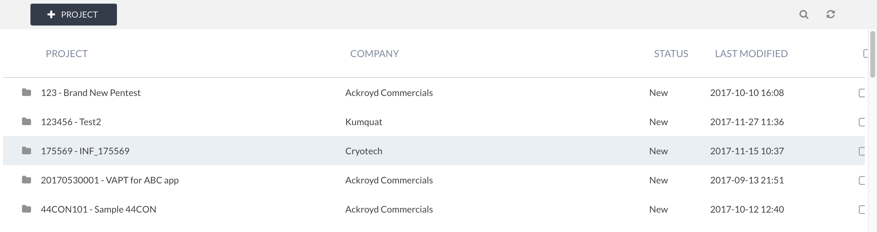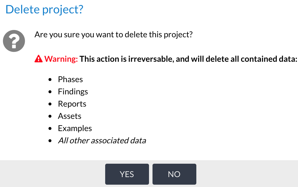 A project is a top-level container for organising phases and reports (which contain findings, assets, examples, and so on). It is a simple container, which allows for grouping multiple related phases together, organising long running or re-test phases, and managing client reports.